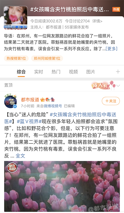 一則「女孩嘴含夾竹桃拍照中毒送醫(yī)」新聞上了熱搜。